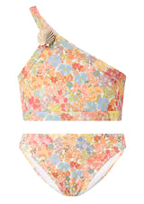 The Avelle Bikini is crafted in our signature floral print and finished with luxe detailing. The one-shoulder bikini top features a gold seashell embellishment at the strap for a touch of seaside glamour. Both pieces are cut from smooth stretch swim fabric and fully lined for comfort and shape retention, making this set as practical as it is stylish.