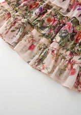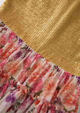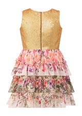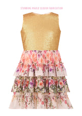 The Harper Sequin Dress is a dazzling mini dress with a gold sequined bodice and a Marlo exclusive floral print tiered skirt. This dress is perfect for making a bold and fashionable statement.