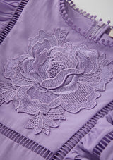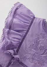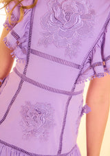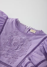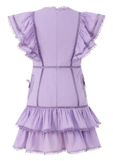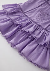 The Carolyn Frill Cotton Mini Dress is a beautifully detailed style featuring delicate embroidered motifs, flutter sleeves, and playful frill tiers. Crafted in a soft lavender hue, this dress blends whimsical charm with timeless Marlo elegance — perfect for birthdays, celebrations, and sunny days.