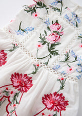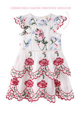 The Maisie Embroidered Frill Dress is a mini dress with an embroidered floral print and short flutter sleeves. This dress offers a charming and playful look, perfect for any event.