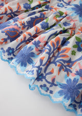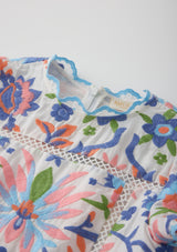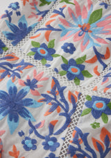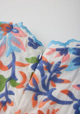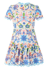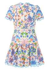The Sarah Embroidered Mini Dress is a vibrant and playful piece showcasing bold multicolour floral embroidery. With short sleeves, scalloped edging and a softly flared hem, this dress brings joyful charm to any special occasion.