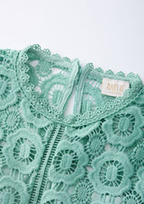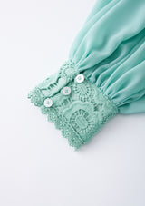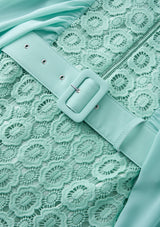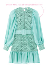 Make a statement with the Adelaide Embroidered Dress. Featuring embroidered details, long bishop sleeves, and a matching belt, this mini dress is perfect for a charming look.