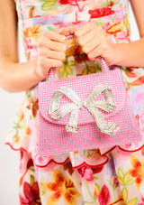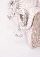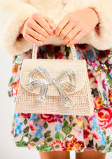 Add a touch of sparkle to every outfit with the Adalyn Diamante Bag. Adorned with shimmering crystals and a statement bow embellishment, this mini top-handle bag is perfect for festive occasions and special celebrations. Available in soft white and pretty pink, it pairs perfectly with every Marlo holiday look.