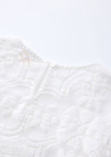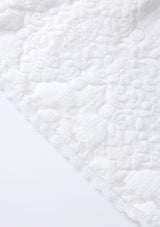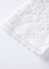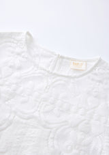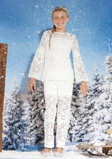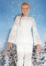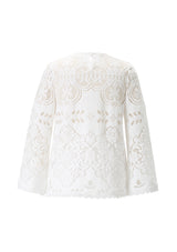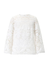 The Estelle Lace Top is an elegant ivory lace top with long flared sleeves, perfect for pairing with jeans or the matching Estelle Lace Pants for a coordinated look. It's ideal for adding a touch of sophistication.