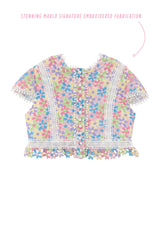 Add a touch of elegance to their wardrobe with the Giselle Embroidered Top. With short sleeves and an embroidered floral fabrication, it's perfect for versatile styling.