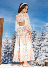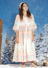 The Lyla Embroidered Maxi Dress features Marlo exclusive embroidery, long balloon sleeves, an open back, and tie-up front details. This dress is perfect for creating a stylish and unique look.