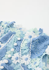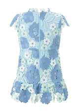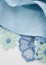 The Jade Embroidered Mini Dress is a beautifully structured piece showcasing delicate powder blue florals and intricate lace applique. With its scalloped trims and flounce hem, this dress is perfect for special events, celebrations and standout moments.