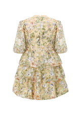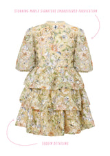 The Clarissa Embroidered Dress is a charming mini dress with exclusive Marlo 3-dimensional floral fabrication and puff sleeves. It's a unique and delightful choice for any event.